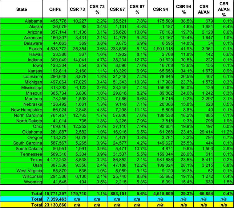 - There's also a small number of American Indians & Alaska Natives (just 67,000 nationally this year...0.4% of all enrollees) who are eligible for what amounts to a 100% AV (no cost sharing at all) Silver CSR plan.
