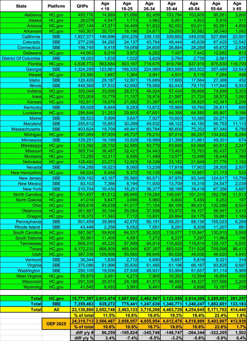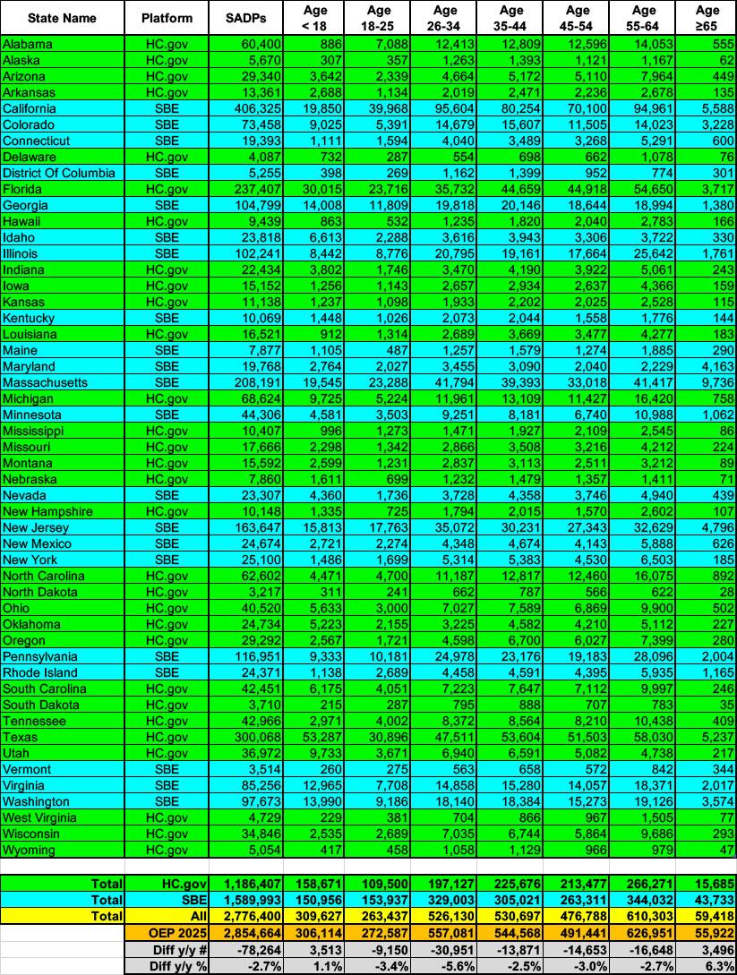 • As expected given the subsidy expiration, enrollment among young adults plummeted (down 7.4% & 8.5% among 18-25 yr olds & 26 - 34 yr olds respectively). This will absolutely have a disproportionate negative impact on the risk pool (and, thus, gross premiums) next year