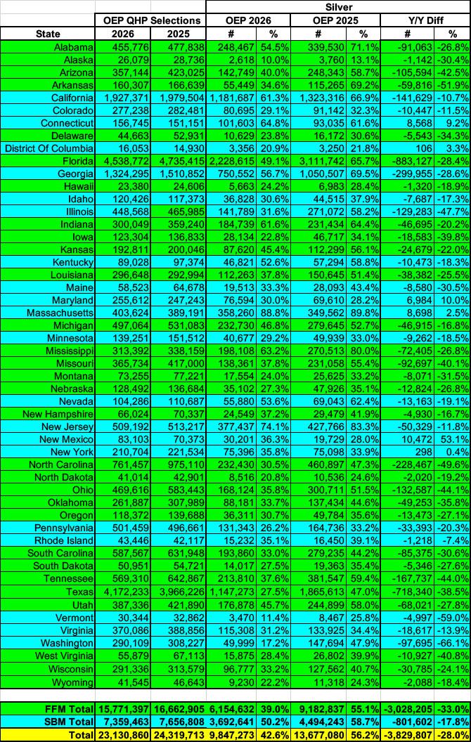 Finally, Gold plan enrollment, which I was expecting would also drop, actually increased in both raw numbers as well as as a percentage of the total, from 13.2% to 17.2% of all 2026 OEP plan selections...again for reasons I'll discuss soon.