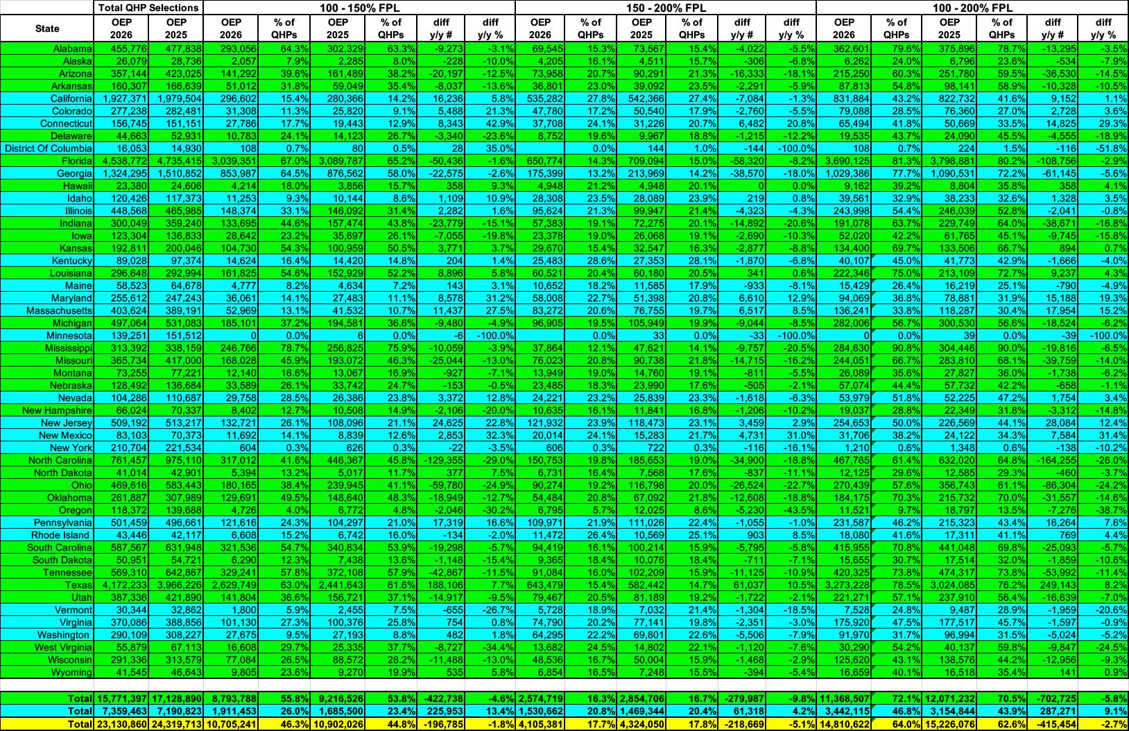 Combined, enrollment in the 100 - 200% FPL range dropped by over 415,000 people, or 2.7% nationally, although there are 16 states where it actually increased, and 5 states (all blue, all operating their own exchanges) where it increased by double digits: