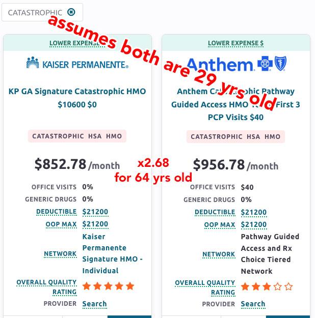 HOWEVER, they're not 29 years old. They'll both be 64 next year, and assuming the Age Band multiplier for Catastrophic plans is the same as it is for other individual market plans in Georgia, you'd have to multiply those prices by 2.68, which would put the cost of a Catastrophic plan for this couple at $2,286 or $2,565/month...basically the same as a Bronze plan anyway.