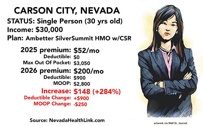 In the appropriately-nicknamed Silver State of NEVADA, I'm going to use a 30-yr old single woman earning $30,000/year in Carson City. The benchmark Silver plan there is an Ambetter via SilverSummit HMO plan for just $52/month. Her annual income is just under the cut-off for her to qualify for generous Cost Sharing Reduction (CSR) assistance to cut down on deductibles & co-pays both years.