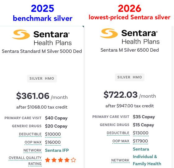 Anyway, the benchmark plan in 2025 is a Sentara Standard Silver plan, for which they're paying $361/month. Next year, however, the lowest-priced Sentara Silver plan will cost them $722/month... exactly twice as much.