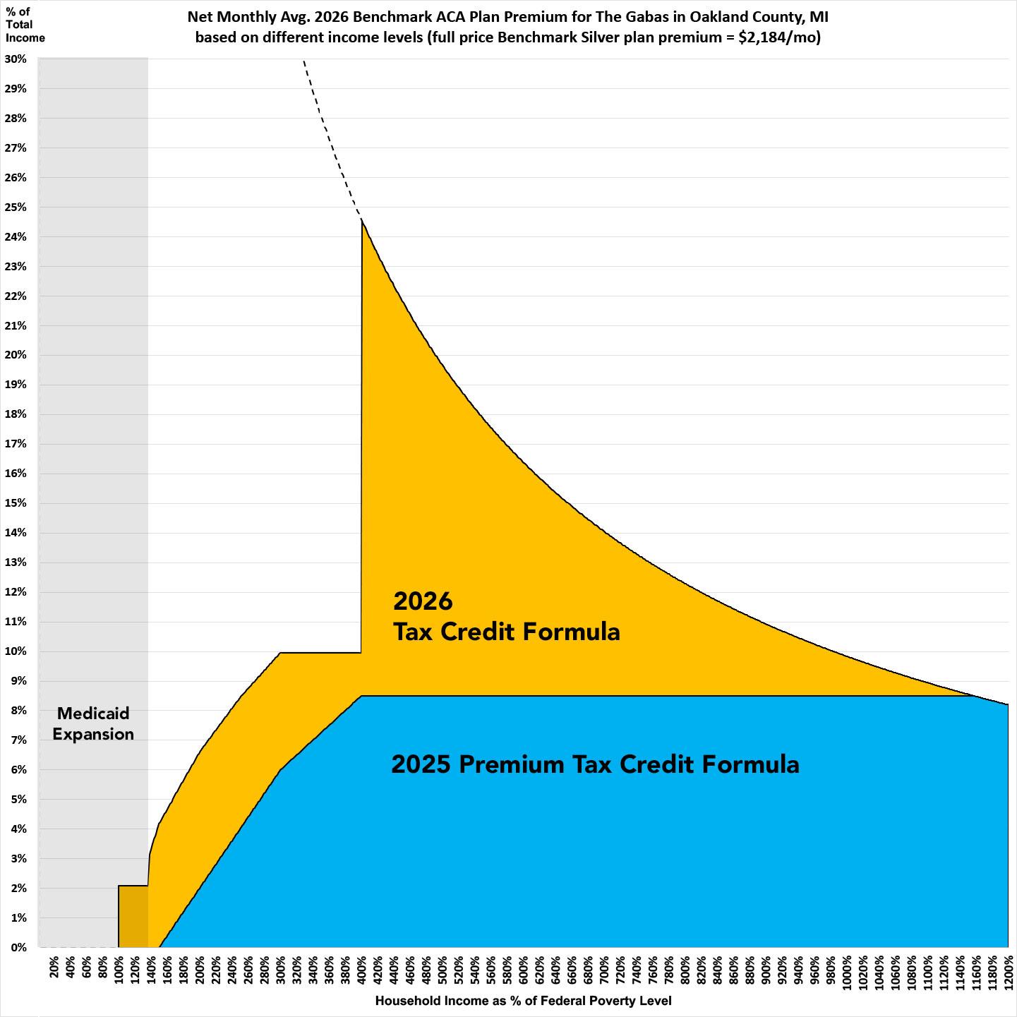 The table below compares the APTC income eligibility formula for 2025 with the enhanced tax credits to what it will change to starting in January 2026 without them. The FPL income levels are for 2026.