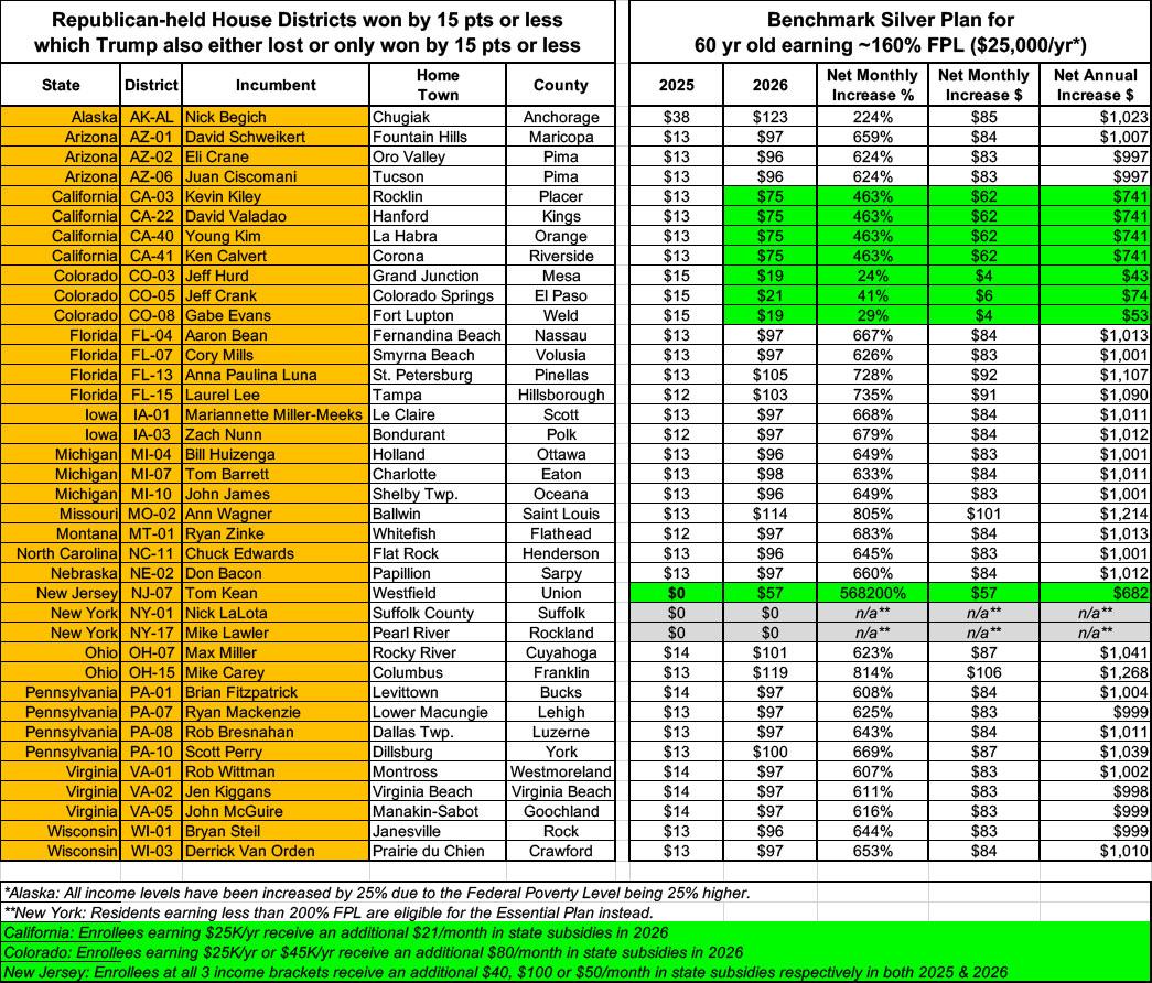 In NY-01 (Nick LaLota), a 60-yr old enrollee will go from paying just $480 to $877/month...an 83% rate hike. And that's the least-dramatic example.