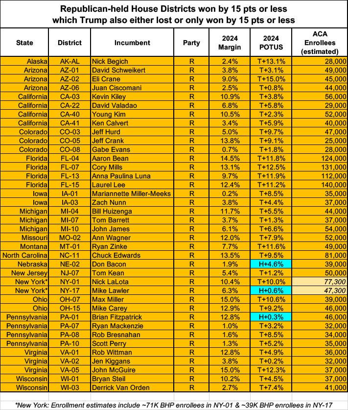 That leaves 38 GOP-held House seats where the Republican won by 15 pts or less and where either Kamala Harris won, or Donald Trump also won by 15 points or less. The table below breaks these out with both margins, while also listing my estimate of how many residents of each district are enrolled in ACA coverage.