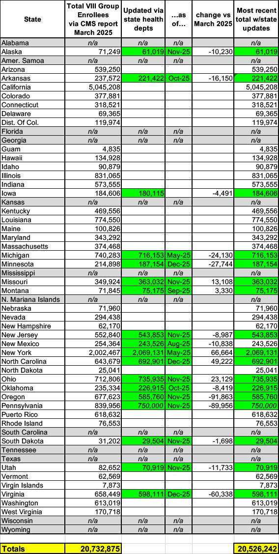 I've been able to cobble together more recent ACA expansion enrollment for about half of the 40 states (+DC) which participate in the program; since March, expansion enrollment has dropped in some states but is actually up in some others. It remains remarkably stable so far, although this is going to change radically with the draconian provisions of the GOP's Big Ugly Bill starting to kick in soon.