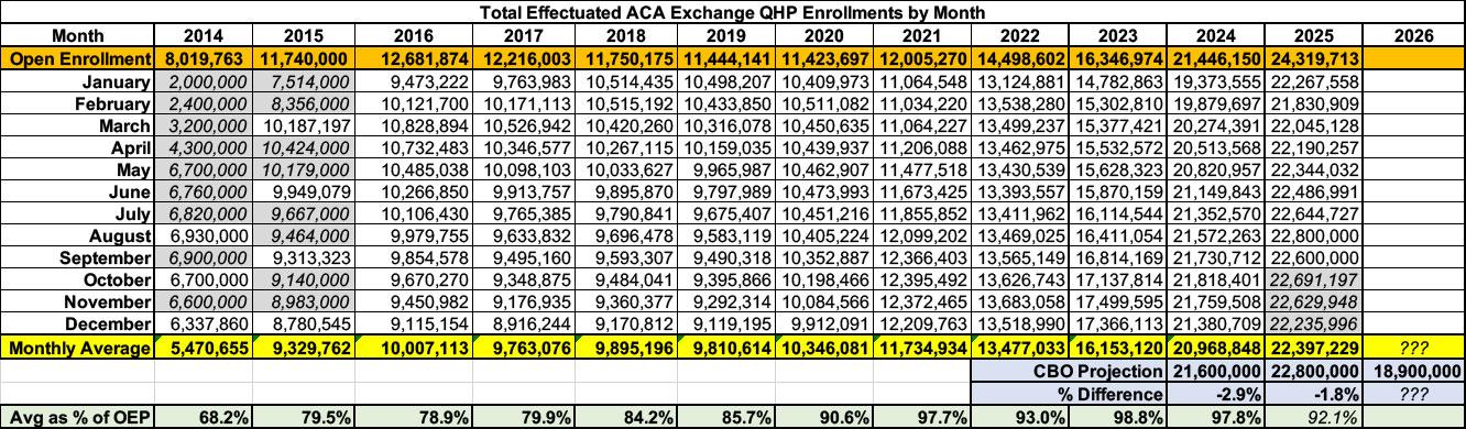 The table below lays all of this out more accurately. The effectuated enrollment numbers for 2014 and 2015 are a bit spotty as the Centers for Medicare & Medicaid Services were a bit scattershot about tracking that data the first couple of years (thus the rounded off greyed-out cells below), but the exact numbers for January 2016 - July 2025 are available via the (CMS) website.