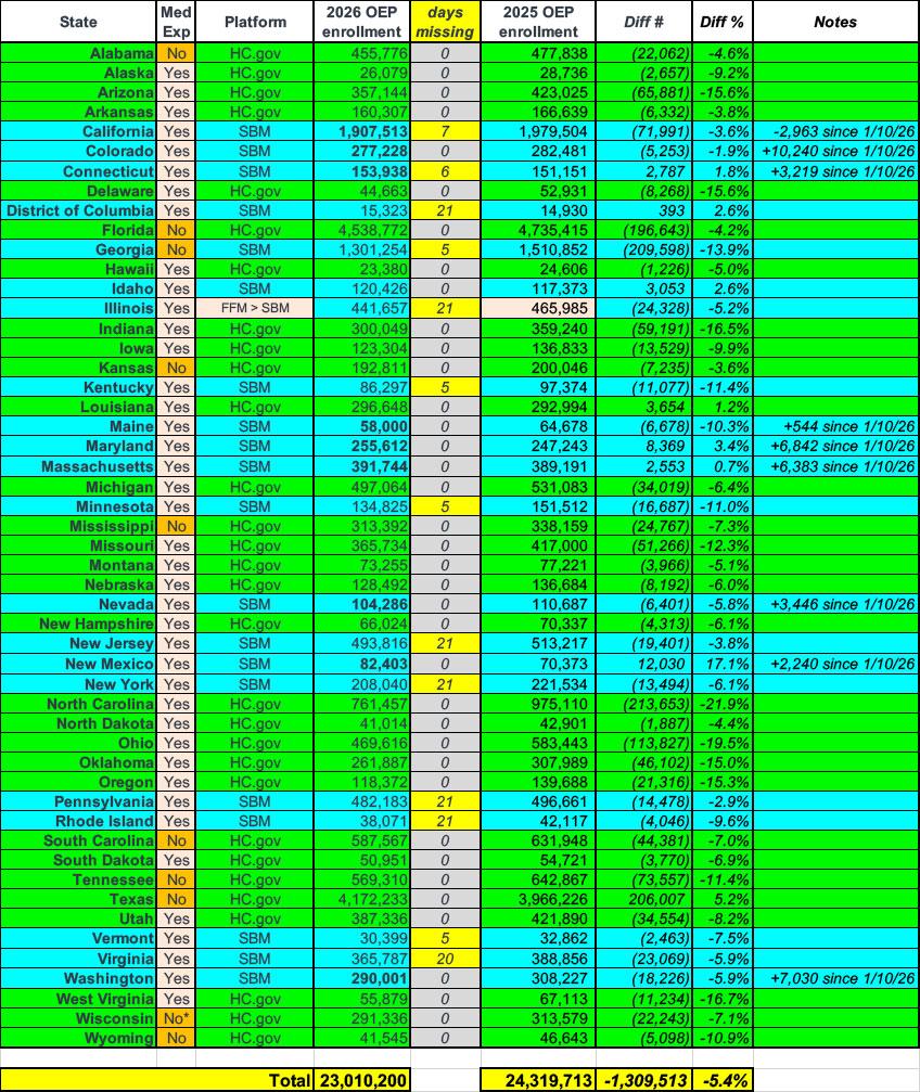 The total of the state by state breakout below is around 37,000 higher than the 2026 summary total above due to my having more recent enrollment data for 9 of the SBM states (CA, CO, CT, ME, MD, MA, NV, NM & WA). I've included columns to note how many days of enrollment data are still missing for 13 of the SBM states:
