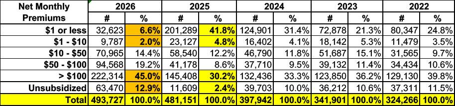 Put another way, the number of enrollees paying $10 or less/month has dropped by over 81%, from 224,416 to just 42,410...while the number paying more than $100/month has increased by a similar 82% (from 157,017 to 285,784).