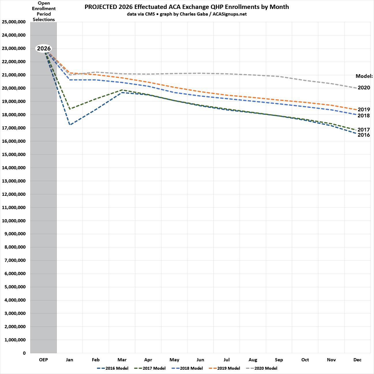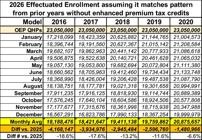 Depending on which year it mimics, average 2026 effectuations will range somewhere between 18.2 million - 20.9 million per month. If so, this would mean anywhere from 1.4 - 4.1 million fewer exchange enrollees than 2025.