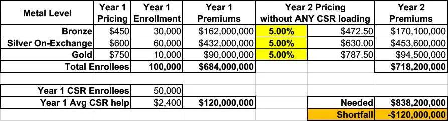 Since the carrier knows they won’t get reimbursed from the federal government for that $120M in CSR costs, raising their premiums by just 5% across the board would mean having to eat a $120 million loss. Ouch: