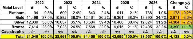 In 2026, just 2,535 (6.6%) of customers are enrolled in a plan with a premium of less than $10/month after tax credits. Comparatively, in 2025, 12,909 (30.2%) of customers paid less than $10/month in premium costs.