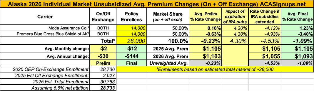 Alaska has around ~28,000 residents enrolled in ACA exchange plans, 88% of whom are currently subsidized. They also have an unknown number of off-exchange enrollees in ACA-compliant individual market policies. Overall, including net attrition, I estimate their total enrollment both on & off exchange to be perhaps ~27,000 or so.