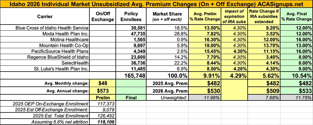The original version of this analysis included a 4.3% increase in the unsubsidized benchmark plan premium based on a projection by the Congressional Budget Office. However, that was a national average projection which didn’t take into account other factors like increased utilization, medical inflation and so on. This updated version assumes the actual 2026 Idaho rate filings.