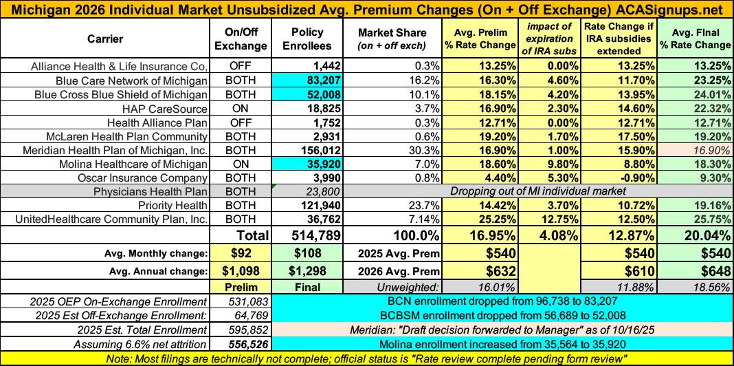 Michigan has around 531,000 residents enrolled in ACA exchange plans, 91% of whom are currently subsidized. I estimate they also have another ~64,000 unsubsidized off-exchange enrollees.