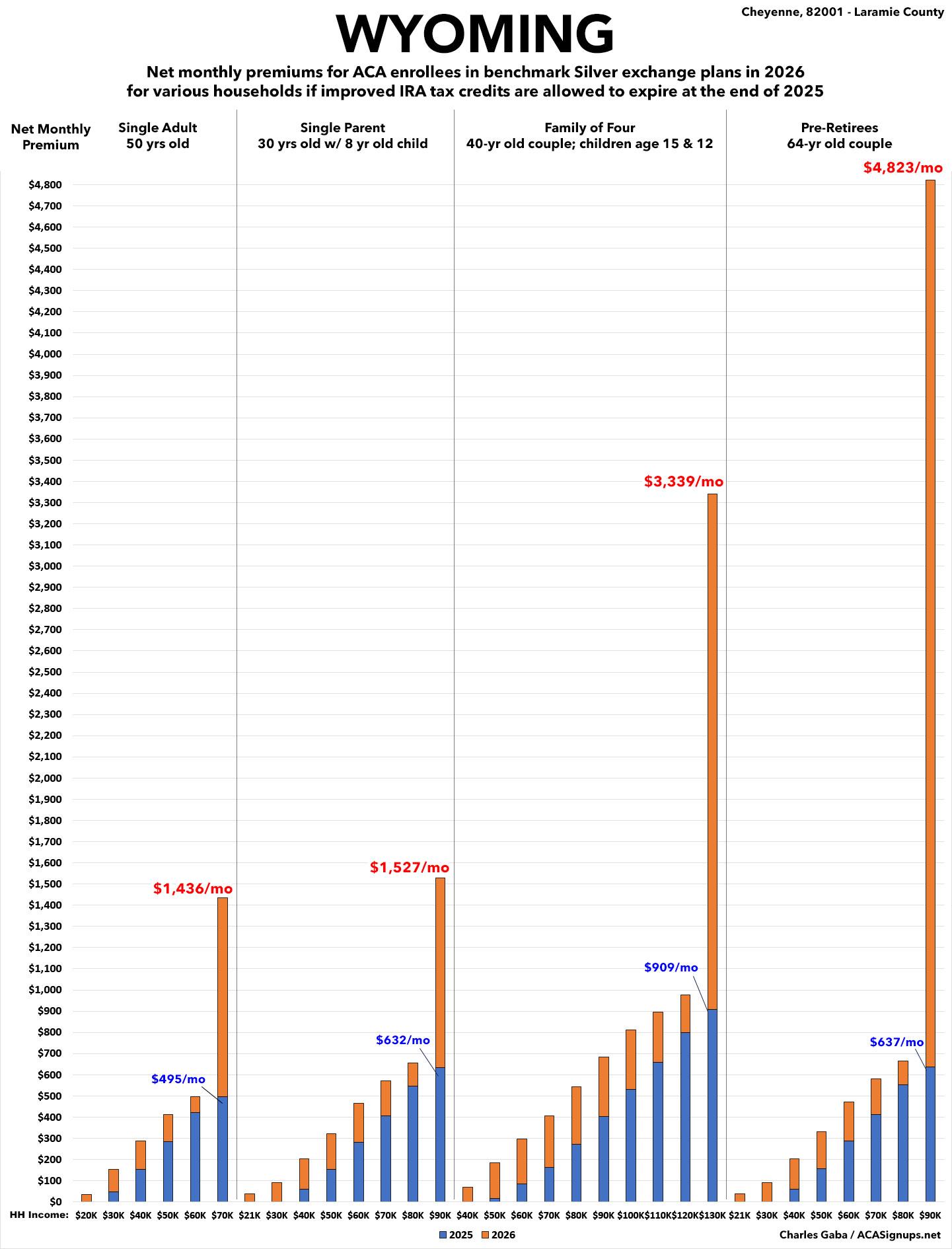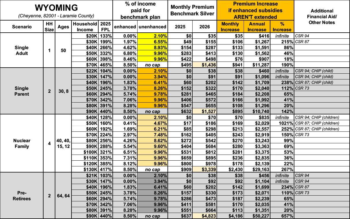 • NEW: The original version of this analysis included a 4.3% increase in the unsubsidized benchmark plan premium based on a projection by the Congressional Budget Office. However, that was a national average projection which didn’t take into account other factors like increased utilization, medical inflation and so on. This updated version assumes the actual 2026 Wyoming rate filings.