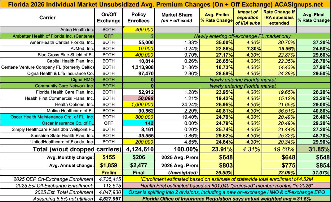 UPDATE 10/17/25: Oh for heaven's sake. It turns out that the Florida Office of Insurance Regulation (FLOIR) quietly published their final/approved 2026 rate filings for the individual market over two months ago and I didn't find out about it until now! A big shout-out to "techbud251" in the comments for alerting me to this PDF buried in the FLOIR website, with the final column labeled "Average % Change Approved."