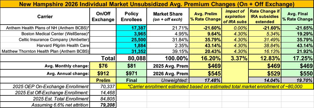 2026 Final Gross Rate Changes - New Hampshire: +17.3%; ~80,000 enrollees facing MASSIVE rate hikes starting in January (updated)